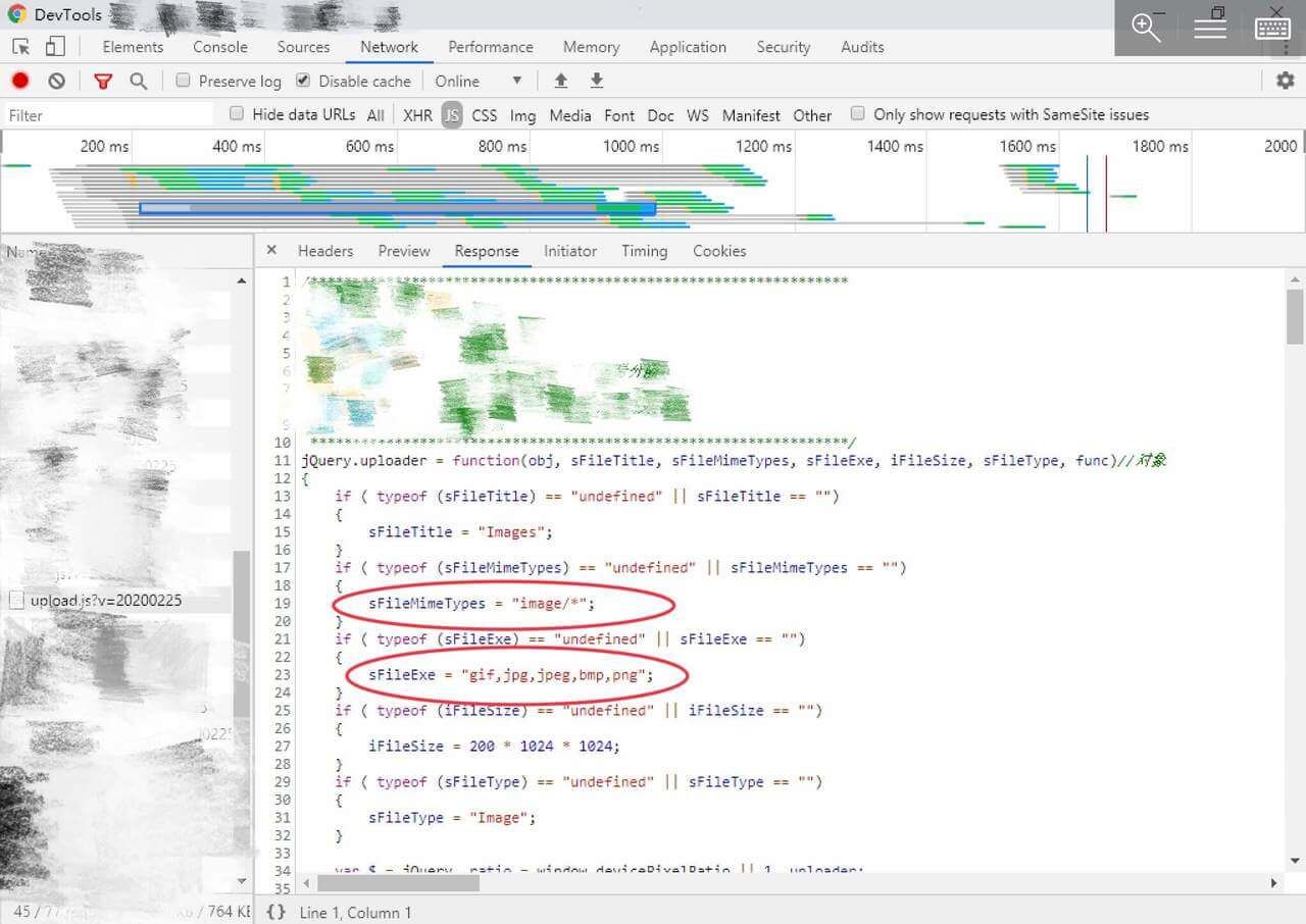 于是打开 F12 开发者视图,在网络选项卡内发现了 upload.js,里面有相关的限制文件类型的代码